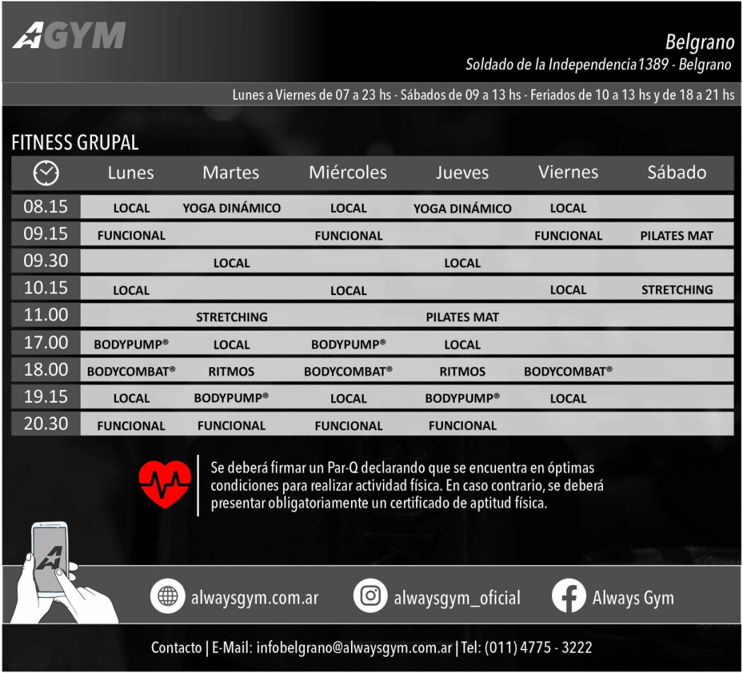 Sedes de Always GymEn Always Gym Belgrano se ofrecen actividades como BODYCOMBAT ®, BODYPUMP ®, Ritmos, Stretching, Entrenamiento funcional, Pilates Mat, Yoga Dinámico y Musculación.