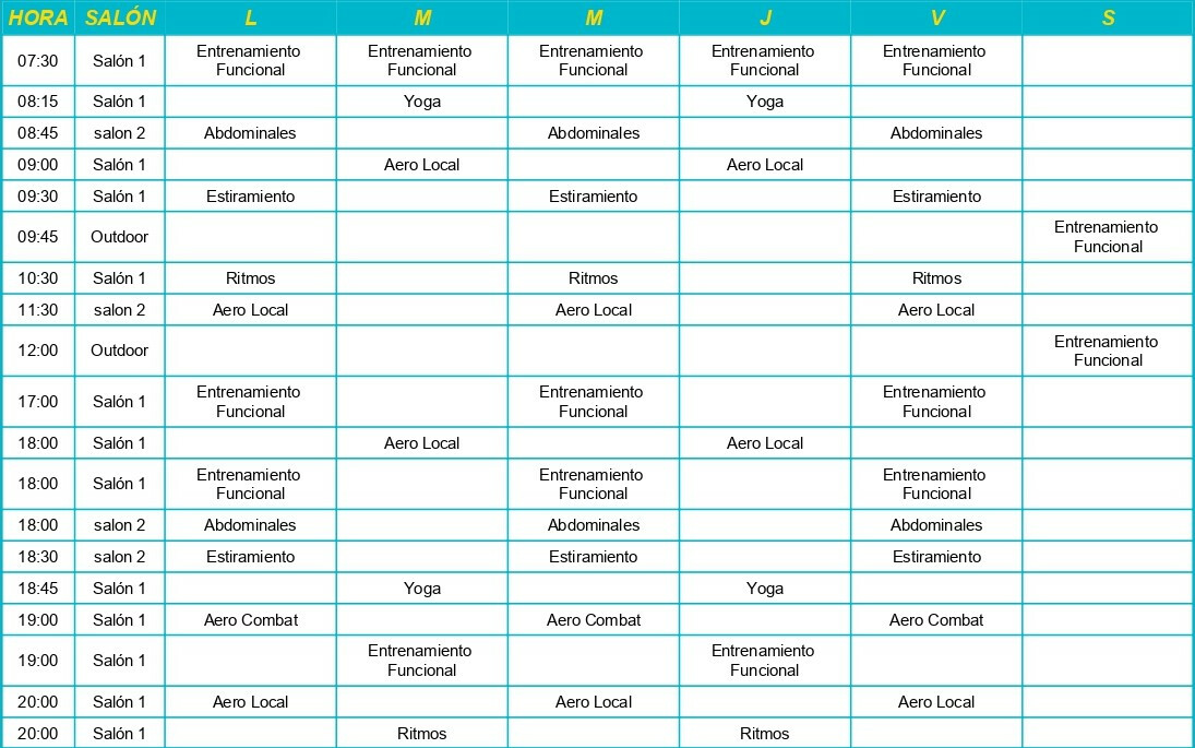 En Fiter Congreso se ofrecen actividades como Abdominales, Aero Local, Elongación, Ritmos, Entrenamiento funcional, Yoga, Musculación y Cardio.