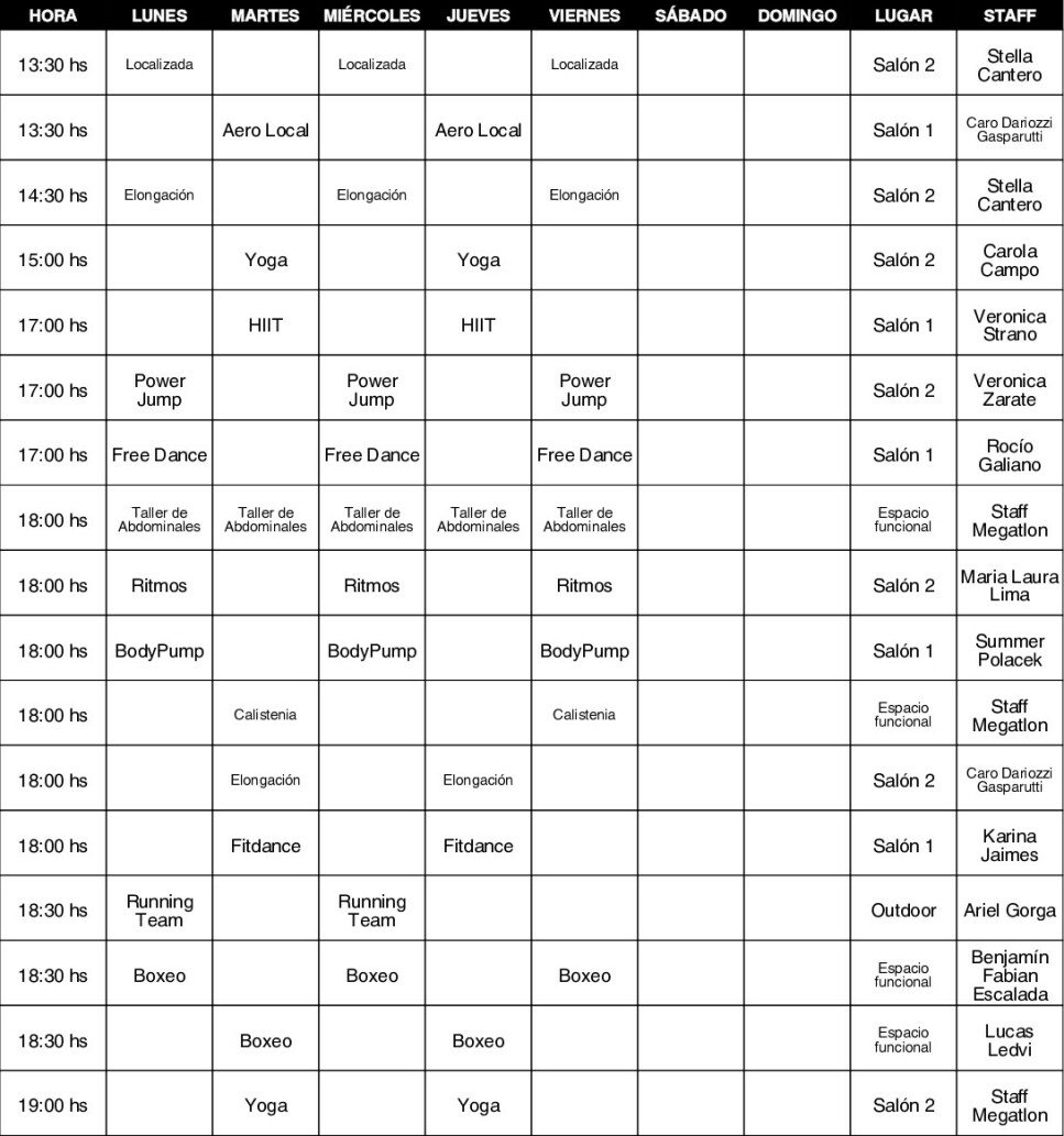 Sedes de MegatlonEn Megatlon Pilar se ofrecen actividades como Abdominales, Aero Local, BODYBALANCE ®, BODYCOMBAT ®, BODYPUMP ®, Elongación, GAP, Gimnasia Acuática, Gimnasia Localizada, Power Jump, Ritmos, Calistenia, CrossFit, Entrenamiento funcional, Spinning, Yoga, Natación, Boxeo, MMA, Grupo de Running, Musculación, HIIT y Cardio.