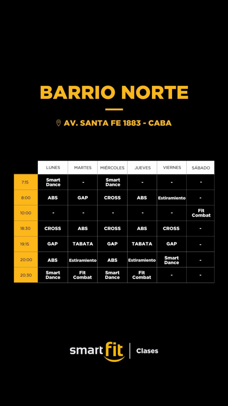Sedes de Smart FitEn Smart Fit Barrio Norte se ofrecen actividades como Abdominales, Fit combat, GAP, Stretching, Tabata, CrossFit, Spa, Musculación y Cardio.