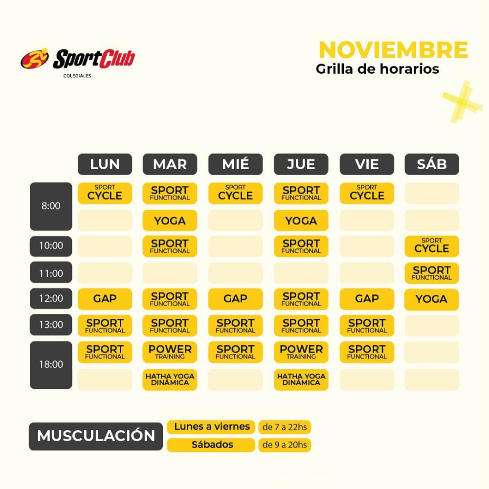 Sedes de SportClubEn SportClub Colegiales se ofrecen actividades como GAP, Entrenamiento funcional, Full Training, Indoor Cycle, Hatha Yoga, Yoga, Musculación y Cardio.
