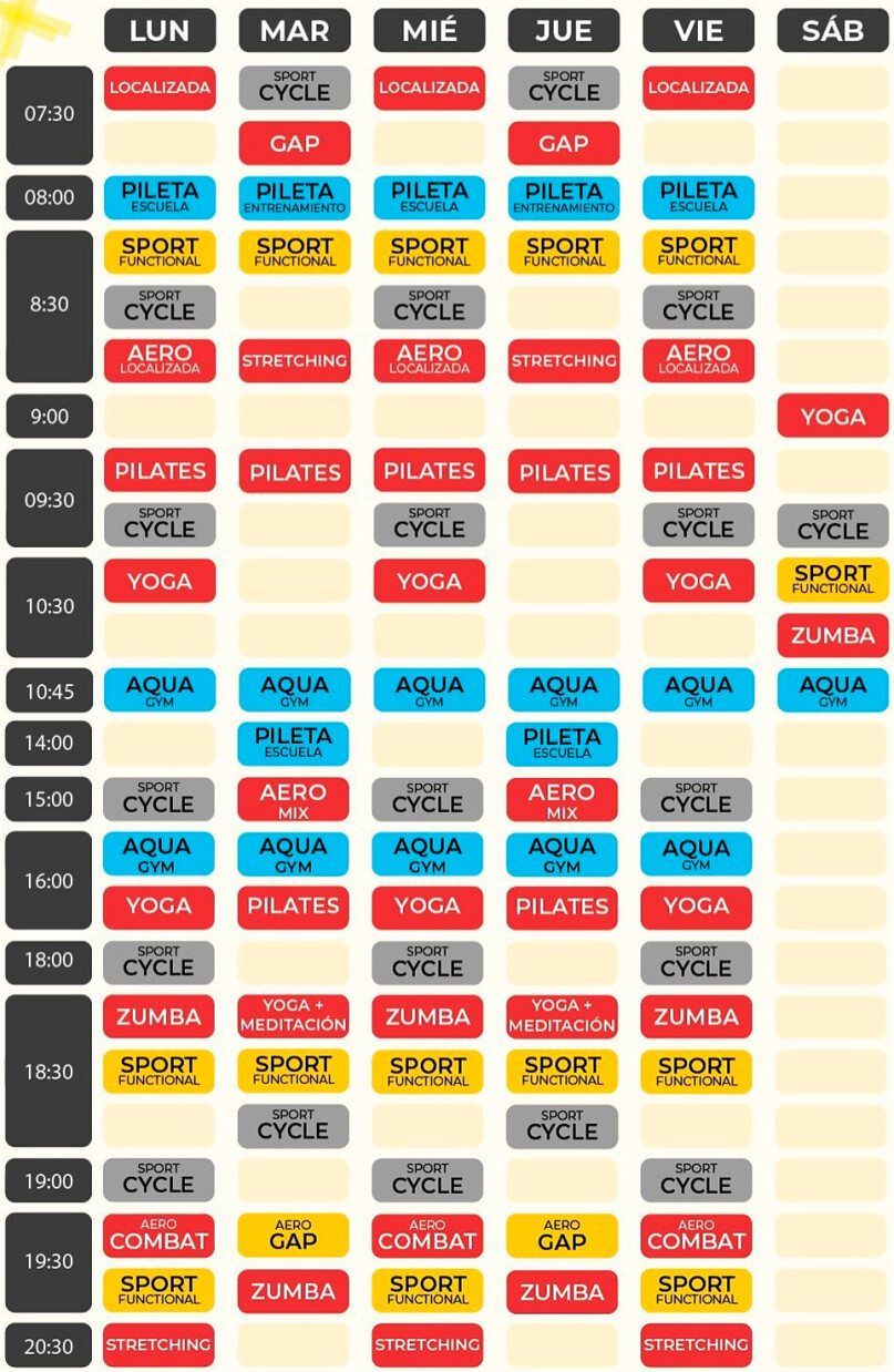 Sedes de SportClubEn SportClub Mar Del Plata se ofrecen actividades como Aero Local, GAP, Gimnasia Acuática, Gimnasia Localizada, Stretching, Zumba, Entrenamiento funcional, Pilates, Indoor Cycle, Yoga, Pileta libre, Natación, Musculación y Cardio.