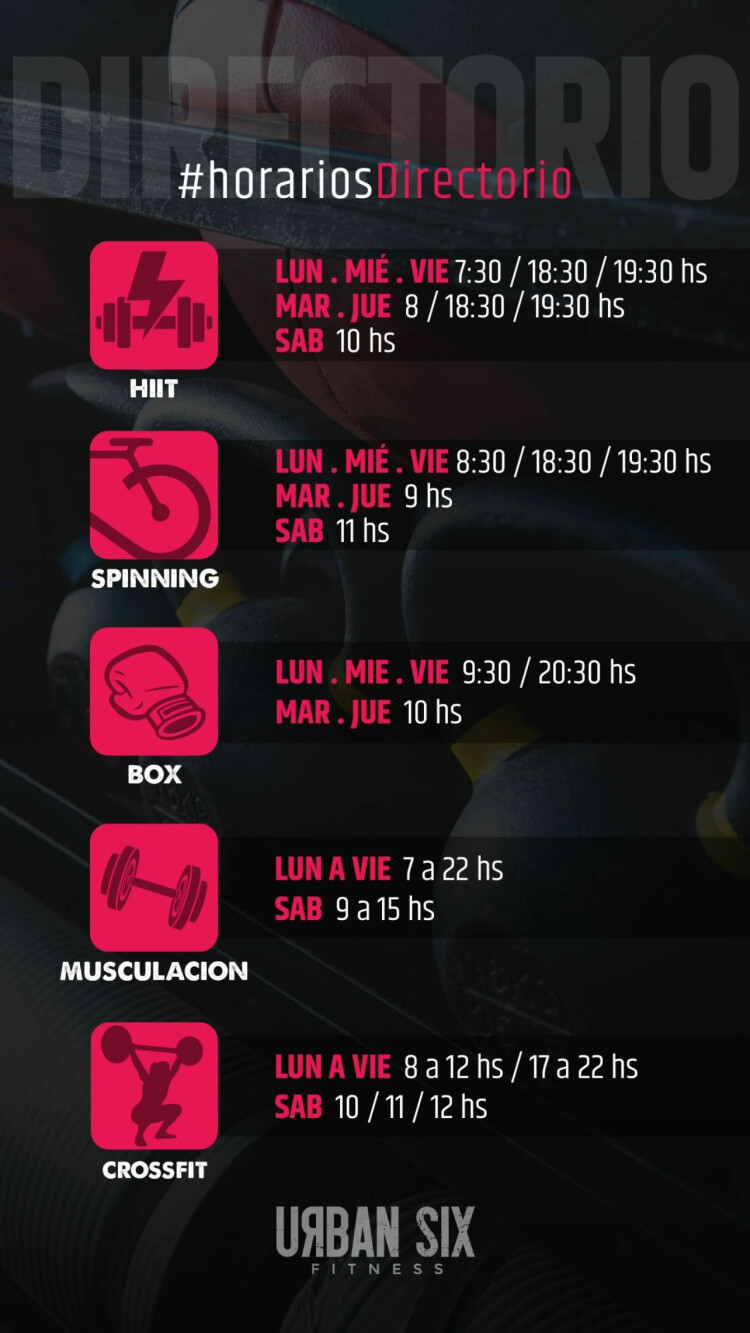 Sedes de Urban SixEn Urban Six Directorio se ofrecen actividades como CrossFit, Entrenamiento funcional, Spinning, Boxeo, Musculación, HIIT y Cardio.